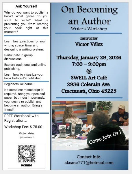 Learn best practices for your writing space, time, and designing a writing system with local author Victor Velez. Participate in group discussions. Explore traditional and online publishing. Learn how to visualize your book before it’s published. Beginners welcome. No complete manuscript is required. Bring your pen and paper, but most importantly, your desire to publish and become an author. Bring a friend!